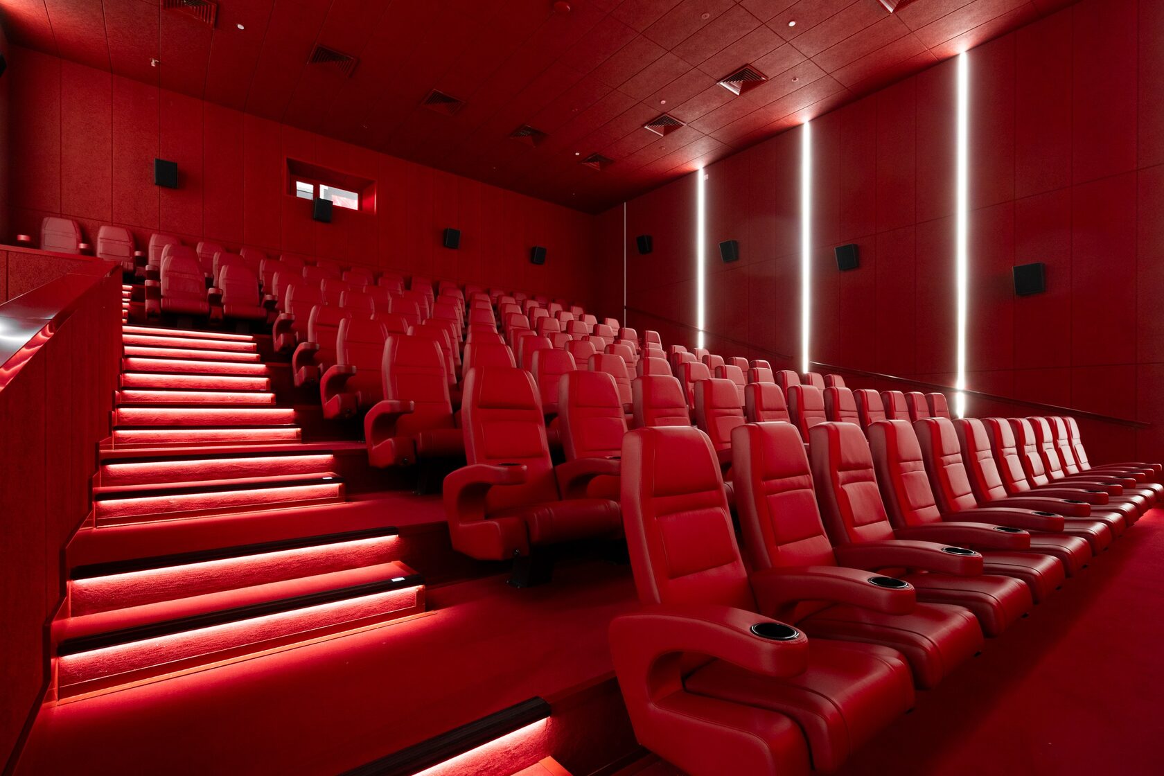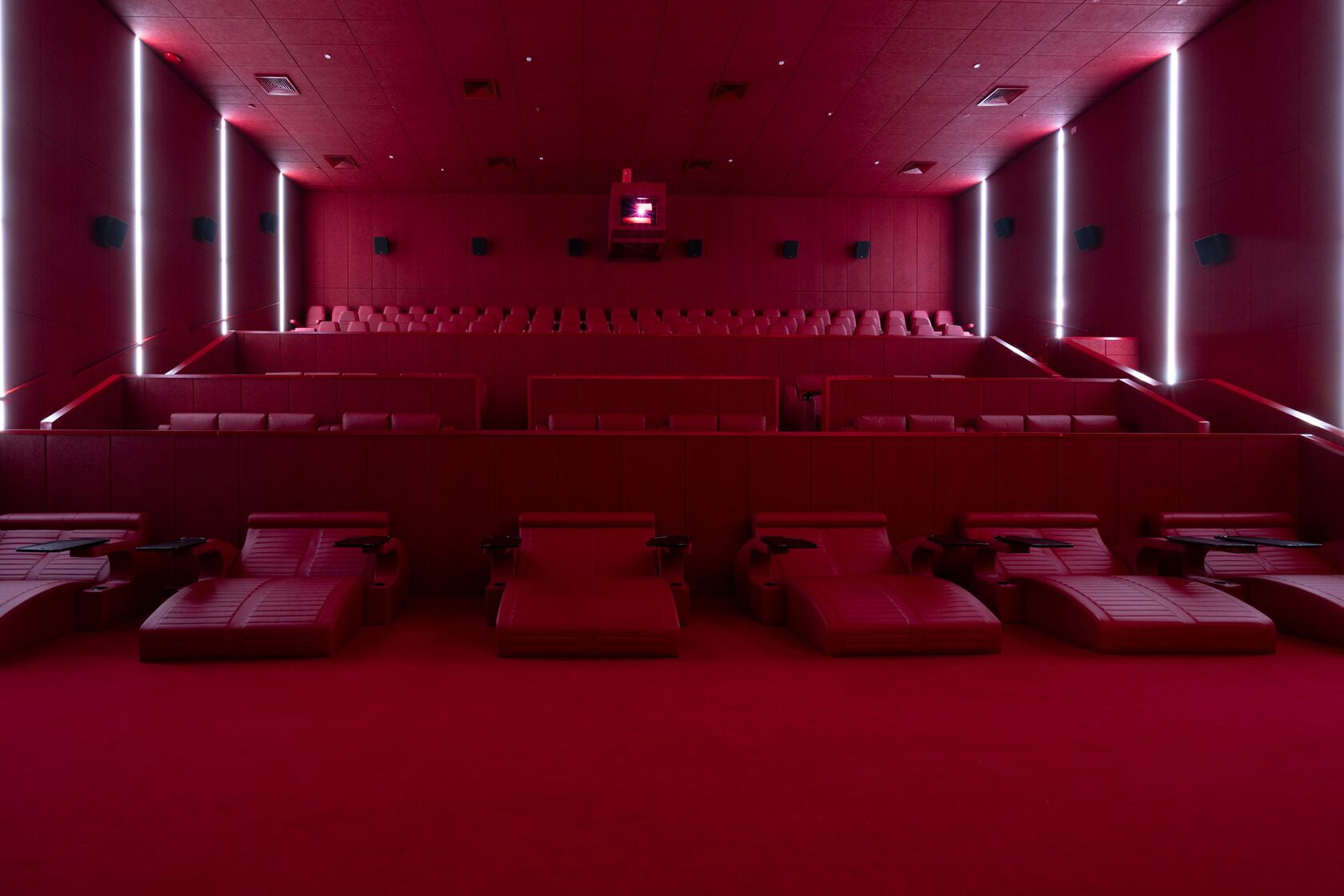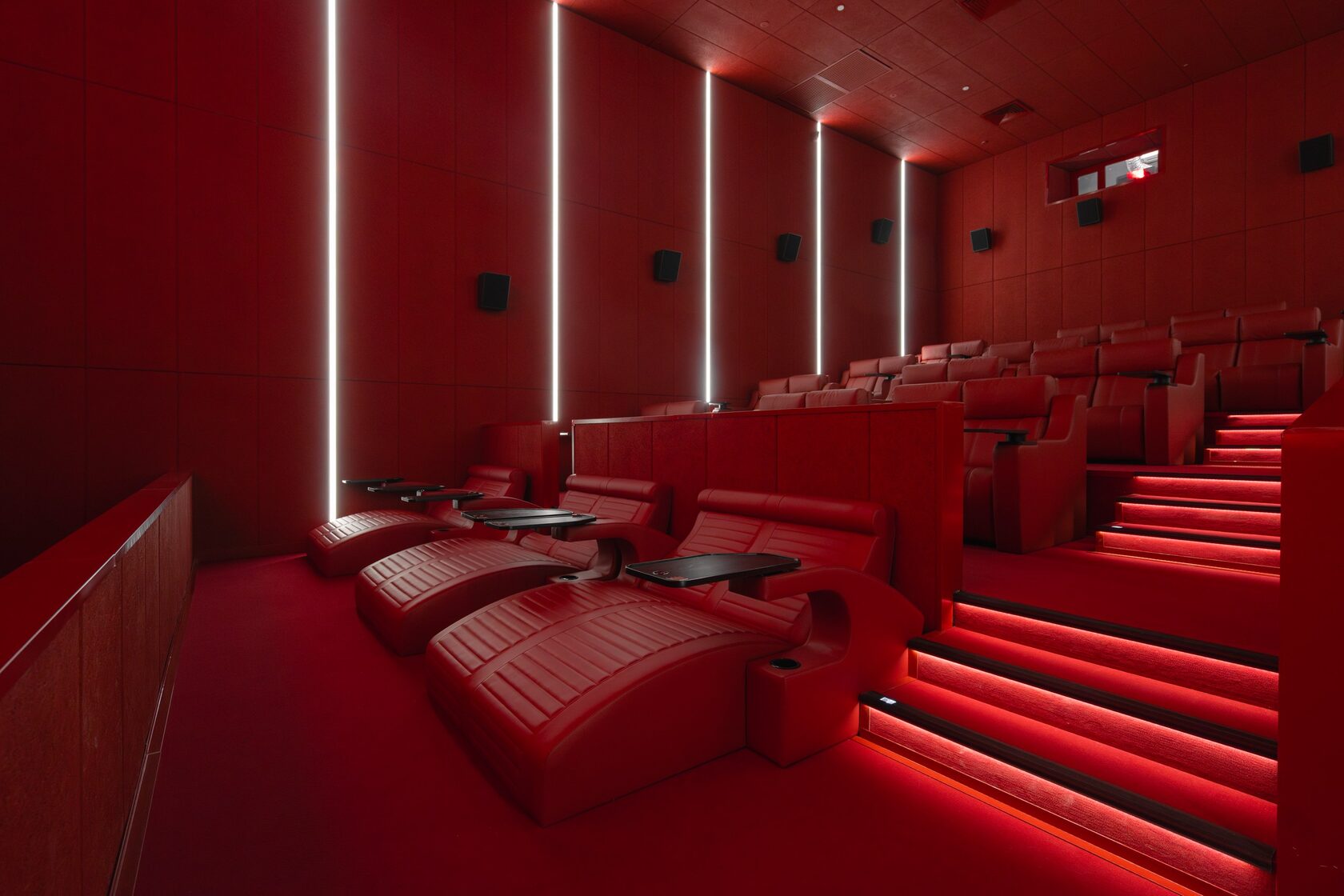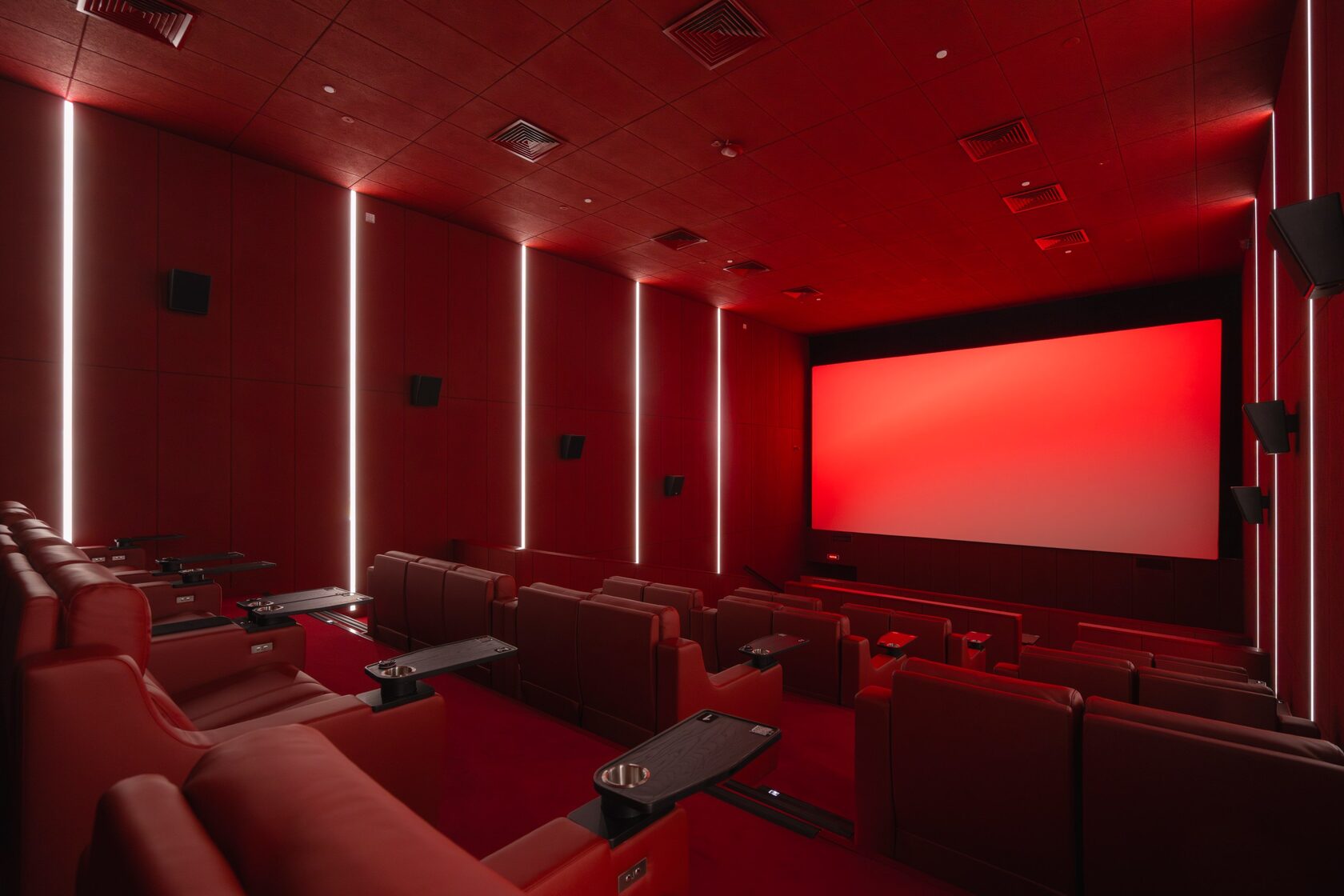 Линейные светильники «Кинолайн» — в трёх залах мы смонтировали линейные светильники с белым светом, которые создают ровное, комфортное освещение и подчёркивают современную эстетику пространства. Корпус светильников был окрашен в фирменный алый цвет